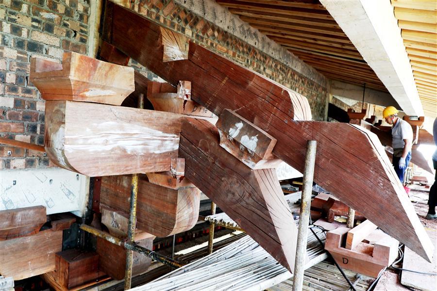 連日來,在該項目湖心閣斗栱安裝現場,每天有20多名經驗豐富的木工師傅在認真進行斗栱安裝作業(yè)。為保證項目質量,解決項目斗栱安裝難題,加快安裝速度,項目部結合實際,通過多次試驗和優(yōu)化設計,確保柱子能承受斗栱重量,采用正裝方式進行安裝,保證了安裝速度和安裝質量。面對項目選用的木制斗栱材料密度大、重量重、安裝作業(yè)工作面窄等困難,木工師傅結合自身多年的木工經驗,克服現場施工遇到的困難,相互配合,目前已完成斗栱安裝工作量的三分之一。