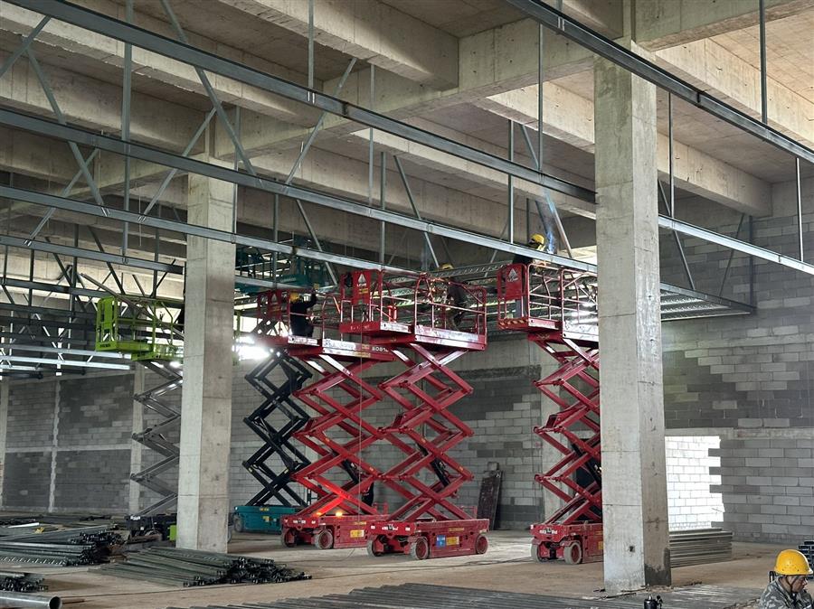 融水縣和睦產(chǎn)業(yè)園項目加班進行安裝屋面鋼絲、涂刷防火材料及場地平整。