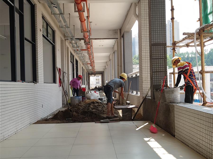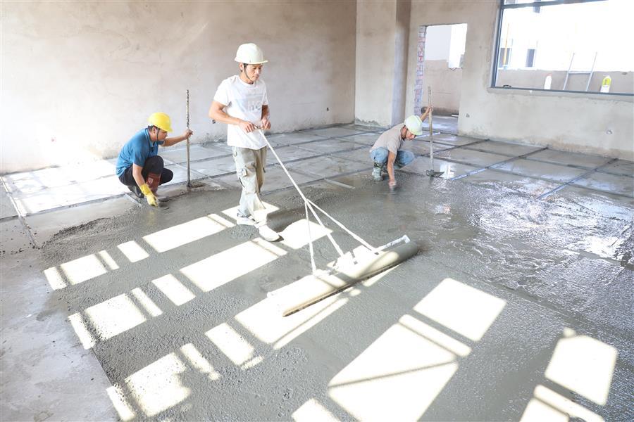 柳州市柳東新區(qū)明德中學項目,工人正在進行4#綜合樓三層水磨石拌合料鋪設。