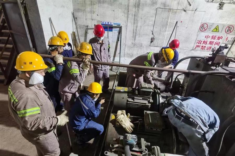 廣西北海市鐵山港區(qū)二煉鋼輔助設備維保年度承包項目,十余名工人在二煉鋼中頻爐液壓站進行電機搶修,加班完成拆除更換任務。