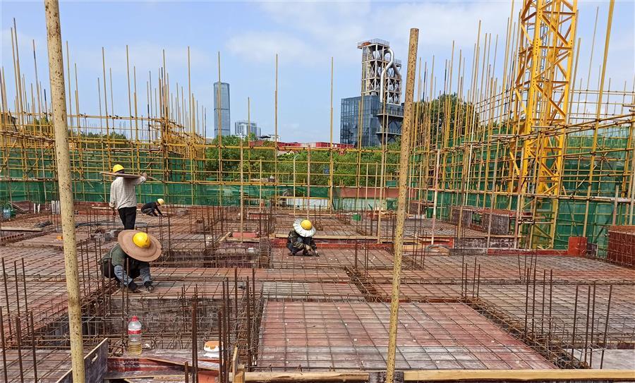 柳州市第三棉紡織廠集資建房項目36#樓、37#樓、38#樓、公廁及垃圾收集點項目,工人正在進行綁扎鋼筋和搭設腳手架。