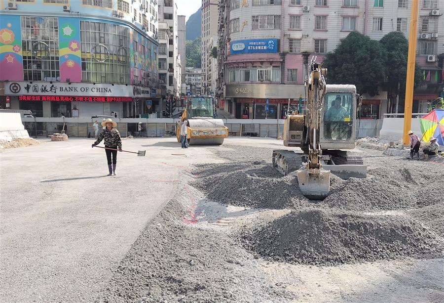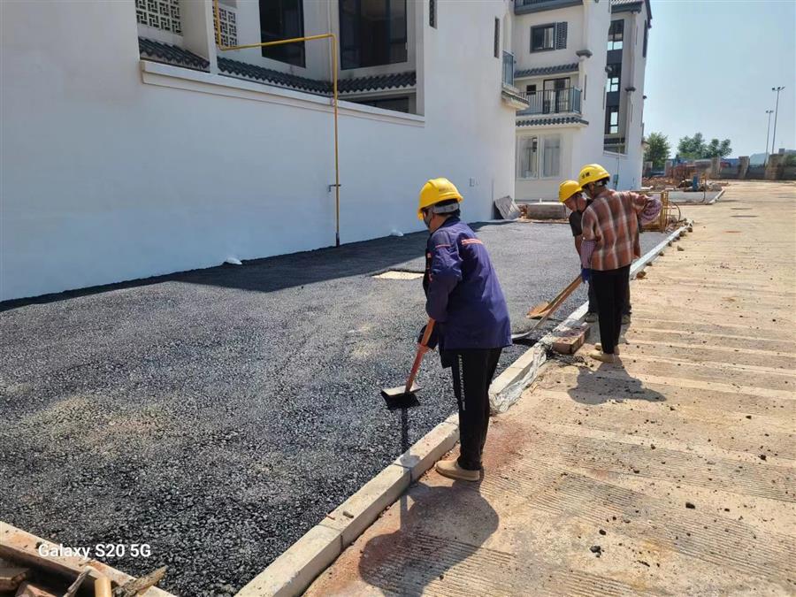 鹿寨縣城南新區(qū)城中村改造項目設計-采購-施工(EPC)總承包項目,工人正在對室外道路鋪設瀝青。