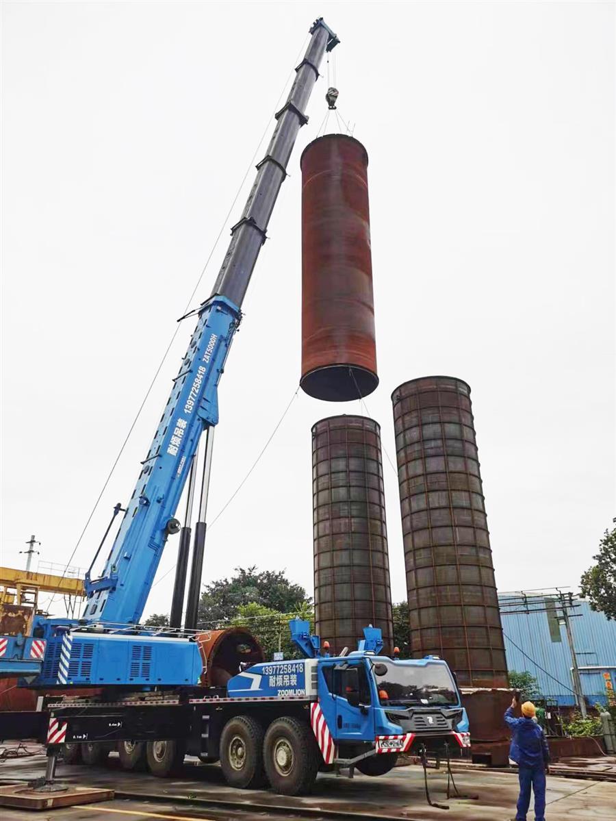 該工程共制作壓力容器設備4臺,其中空氣預冷系統(tǒng)空冷塔1臺,塔身直徑4.236米,塔高28.450米,塔重約71噸;水冷塔1臺,塔身直徑3.824米,塔高22.1米,塔重約38噸;分子篩吸附器2臺,塔身直徑4.236米,塔高18.120米,塔重約63噸。