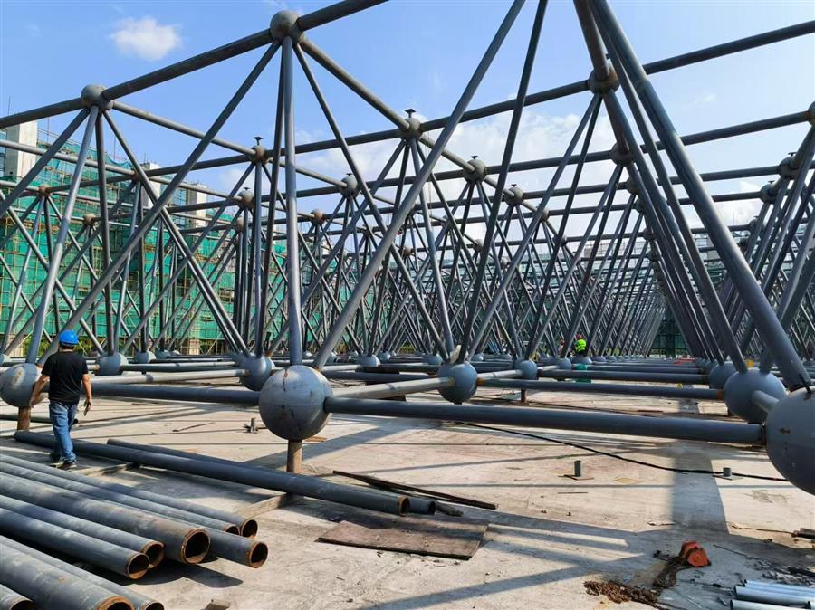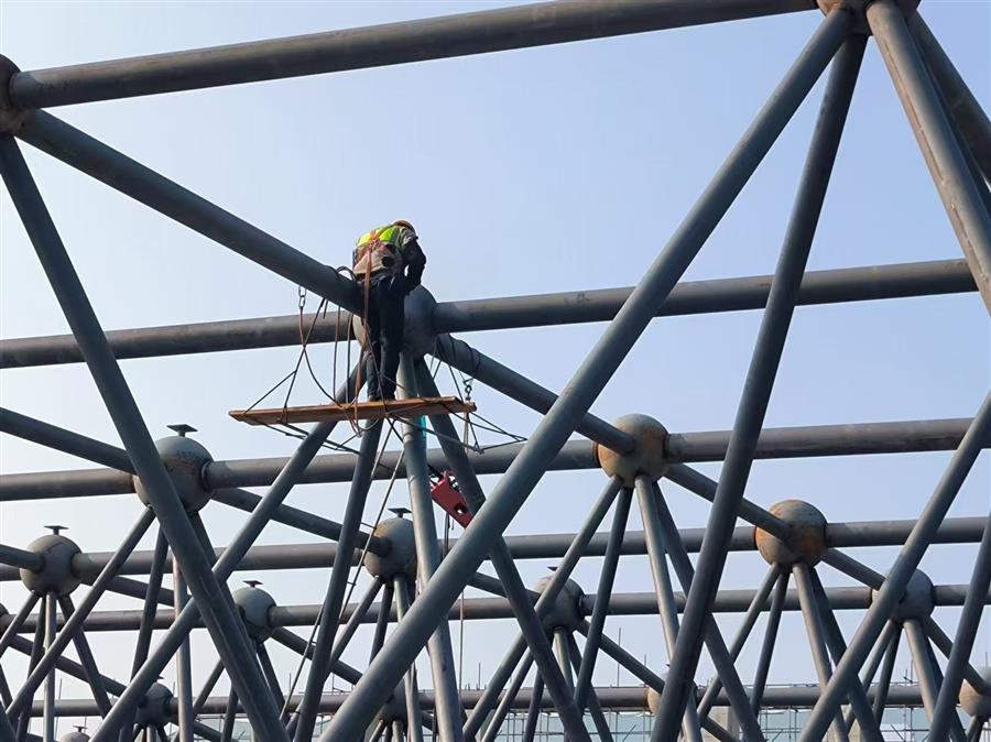 項目正在進(jìn)行鋼網(wǎng)架電焊、焊口除銹、焊口探傷檢測、鋼球補漆等鋼結(jié)構(gòu)施工。為確保項目順利推進(jìn),項目部倒排工期計劃并及時根據(jù)現(xiàn)場情況更新安排,配足人力機械,加班加點,齊心協(xié)力,全員投入推進(jìn)項目建設(shè)。目前,已完成拼裝任務(wù)的50%。