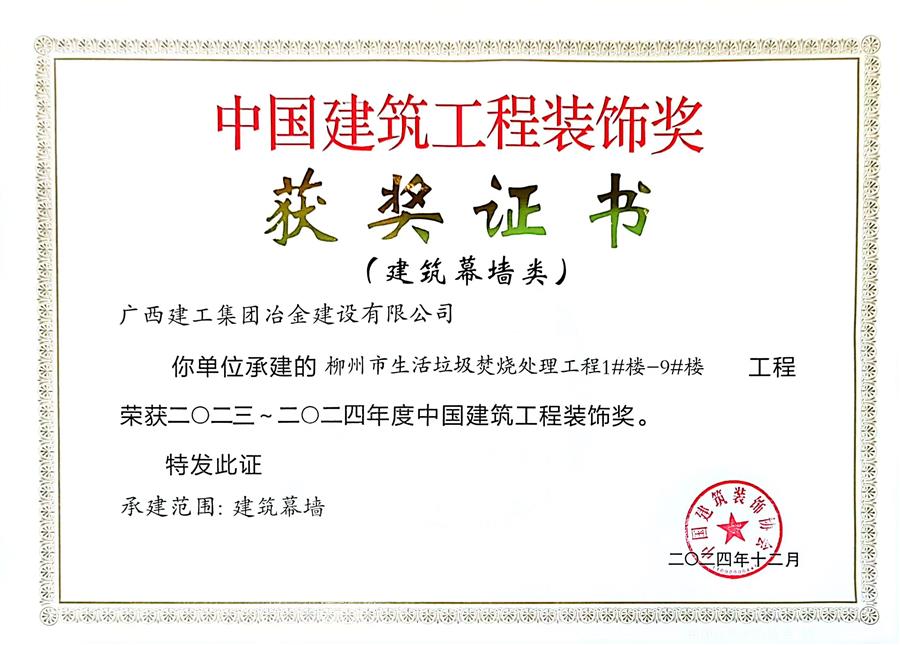 12月10日,中國(guó)建筑裝飾協(xié)會(huì)九屆四次理事會(huì)九屆六次常務(wù)理事會(huì)暨中國(guó)建筑裝飾協(xié)會(huì)成立40周年大會(huì)在北京召開(kāi),冶建公司承建的柳州市生活垃圾焚燒處理工程1#樓-9#樓獲2023—2024年度“中國(guó)建筑工程裝飾獎(jiǎng)”。至此,冶建公司已經(jīng)七奪“中國(guó)建筑工程裝飾獎(jiǎng)”。