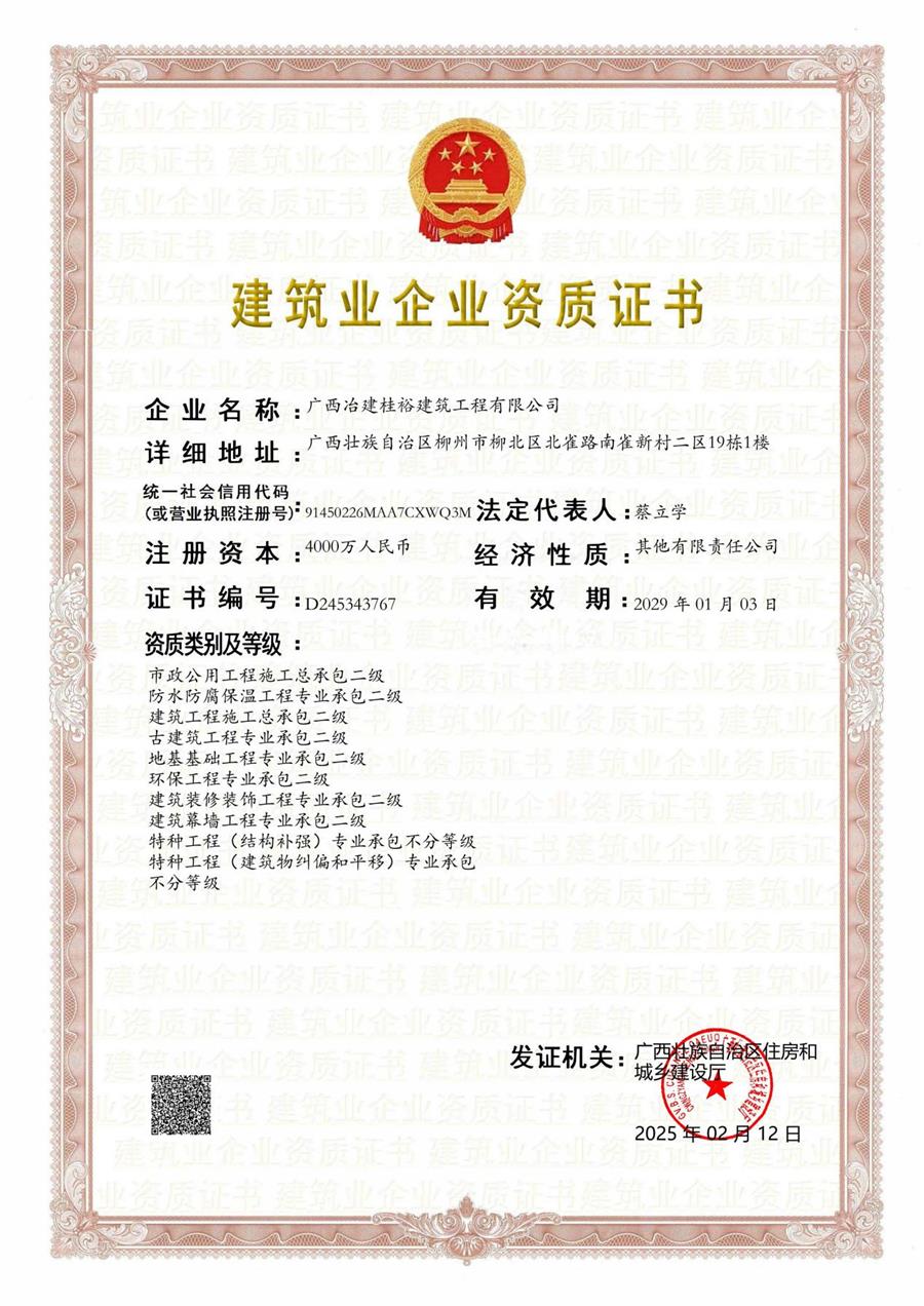 【喜訊】廣西冶建桂裕建筑工程有限公司新增8項專業(yè)承包資質(zhì)