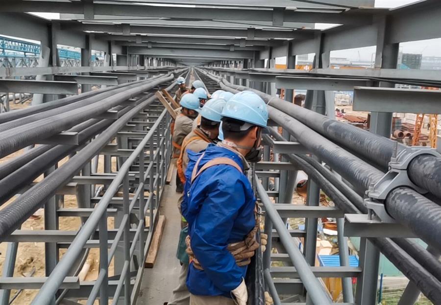 在防城港鋼鐵基地項目(一期)動力系統(tǒng)電力設(shè)施工程——10kV電力電纜敷設(shè)項目施工現(xiàn)場,工人們各司其職、齊心協(xié)力,努力推進項目建設(shè)。